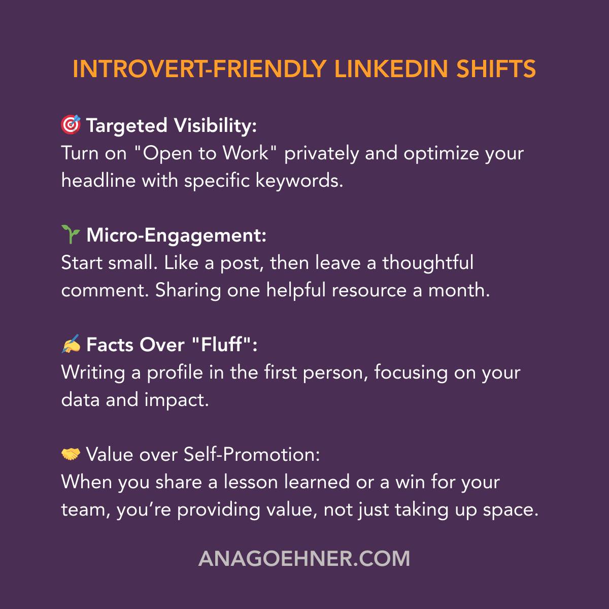 For many introverts, logging in feels like stepping into a crowded, noisy room where everyone is shouting for attention. β You can build a powerful professional presence without the "cringe" or the overwhelm. β Here are 4 introvert-friendly shifts you can make today: β β - Targeted Visibility: β You donβt need to "cold call" recruiters. Turn on "Open to Work" privately and optimize your headline with specific keywords. Let the right people find you. β β - Micro-Engagement: β Forget the pressure to post daily. Start small. Like a post, then leave a thoughtful 1-sentence comment. Sharing one helpful resource a month is better than zero posts a year. β β - Facts Over "Fluff": β Writing a profile isn't bragging if it's based on results. Focus on your data and impact. Writing in the first person makes you approachable without feeling "salesy." β β - Value over Self-Promotion: Reframe "selling yourself" as "sharing what works." When you share a lesson learned or a win for your team, youβre providing value, not just taking up space. β β Which of these feels the most doable for you right now?